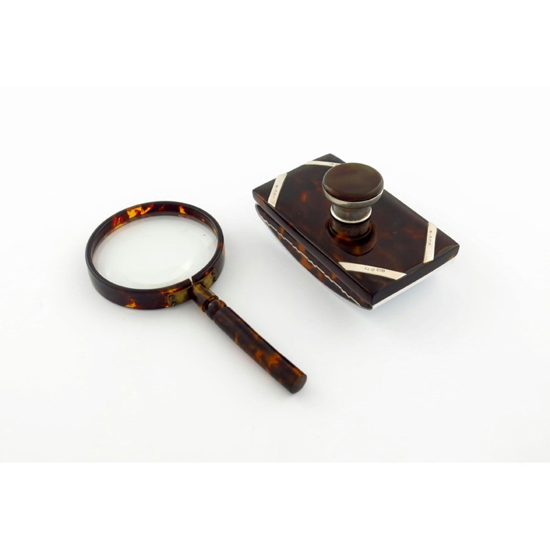 rectangular form, plain silver bands, length 12.8cm, plus a tortoiseshell magnifying glass, length 19.3cm. (2)