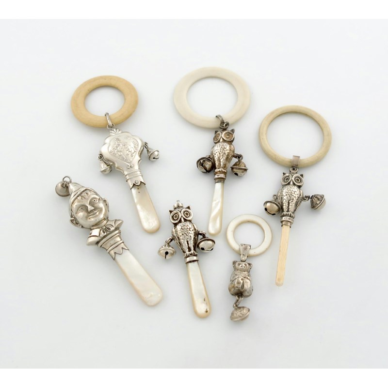 comprising: one modelled as a pixie's head, Birmingham 1936, three modelled as owls, by Crisford and Norris, Birmingham 1920, 1927 and 1949, plus one modelled as a teddy bear, with mother-of pearl handles and plastic rings, (6)