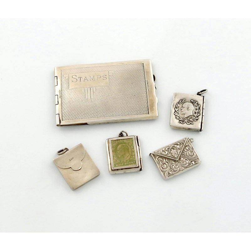 comprising: an Edwardian case set with a stamp, by A. E. Jones Chester 1903, plus two others of envelope form, one of rectangular form, plus a large stamp case with engine-turned decoration and inscribed 'STAMPS'. (5)