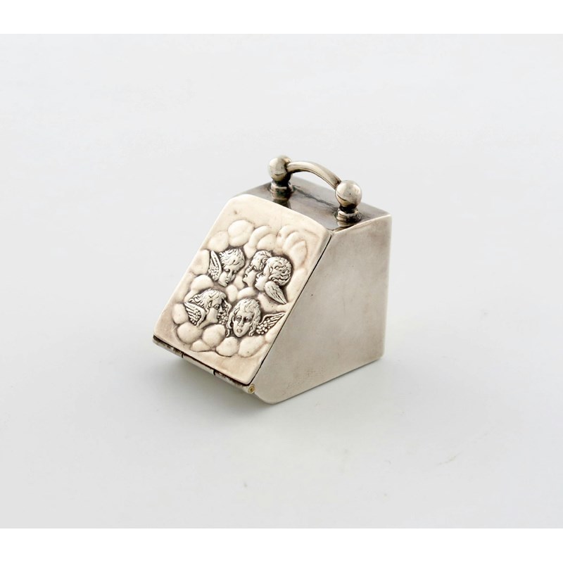 modelled as a coal scuttle, the hinged front embossed with cherubs, height 3.5cm, approx. weight 0.5oz.