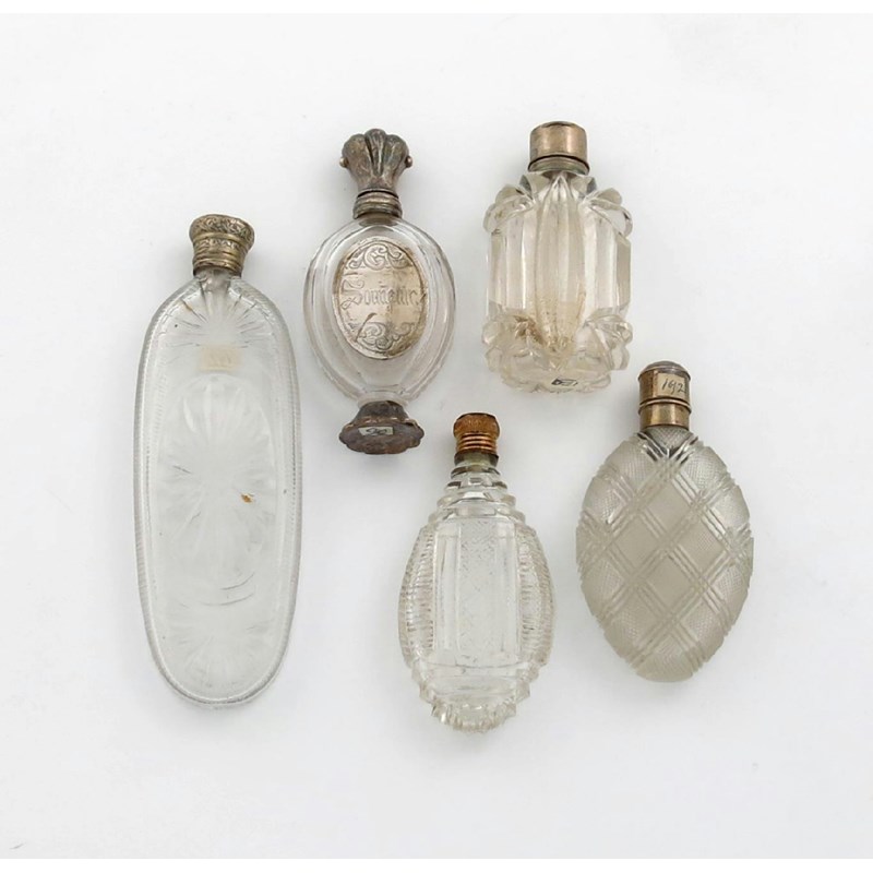 A small collection of four 19th century silver-mounted and one gilt-metal mounted scent bottles,