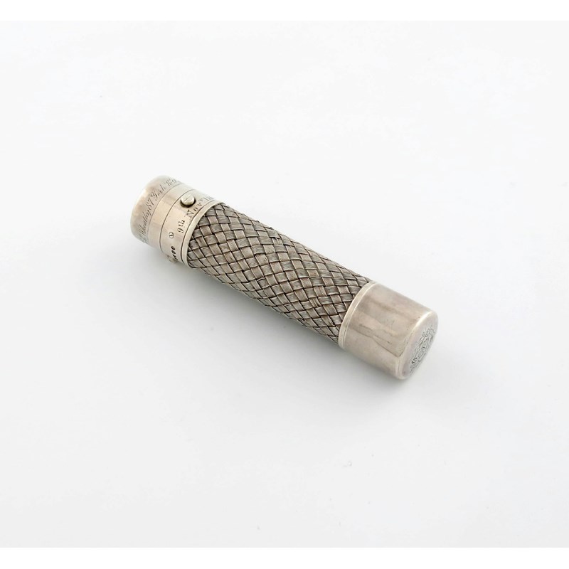 cylindrical form, inter-woven mesh decoration, the ends with a monogram, and the cover inscribed 'Mrs E.E.Wheatley, 87,York Road, Lambeth, SE', also engraved 9th Nov 1884', length 11.5cm.