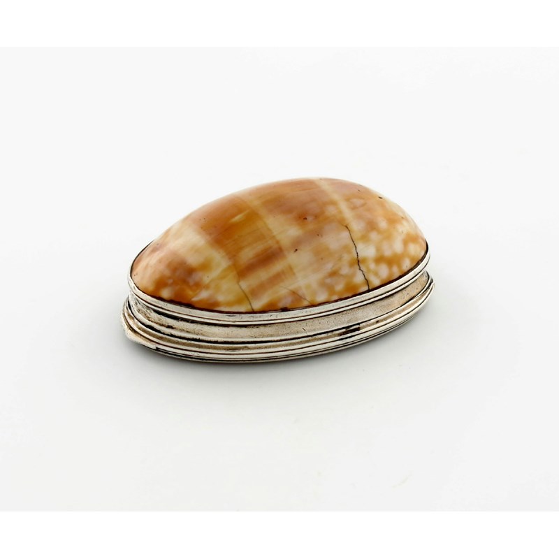 An early 19th century silver-mounted cowrie shell snuff box