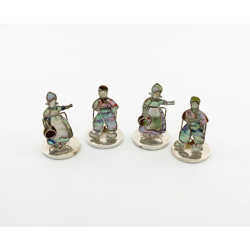 modelled as Dutch boys and girls, with bone faces and traditional dress, on circular bases, height 6.5cm. (4)