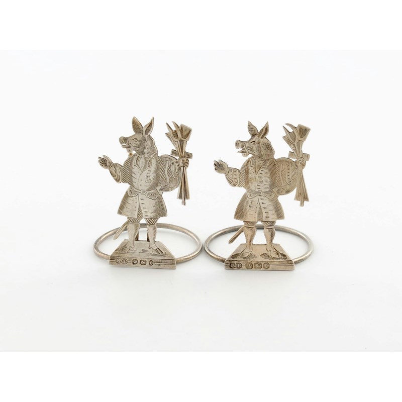 modelled as a standing Trusty Servant, circular ring bases, height 5.3cm, approx. weight 0.8oz. (2)