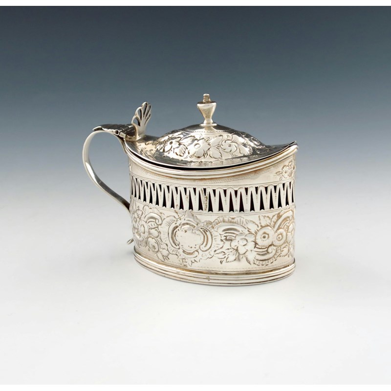 oval form, pierced border, later foliate scroll decoration, scroll handle, the domed cover with an urn finial, with a blue glass liner, length 11cm, approx. weight 3.4oz.