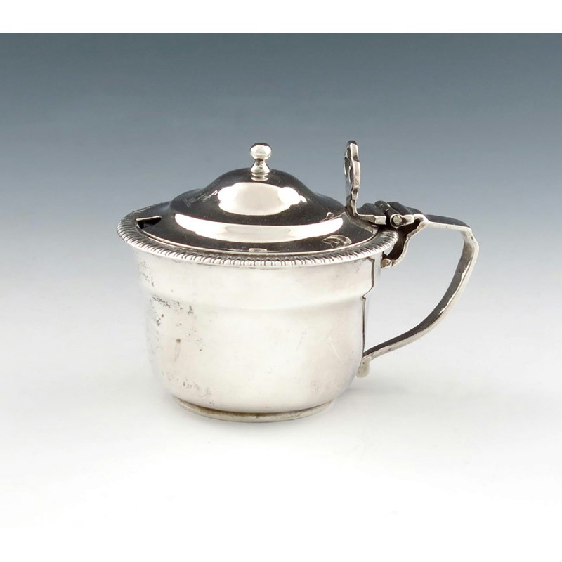 circular form, gadroon border, the domed hinged cover with a ball finial, scroll handle, engraved with a crest, with a glass liner, approx. weight 3oz.