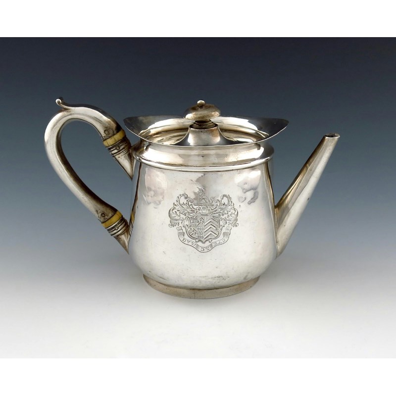tapering circular form, tapering spout, later part-marked scroll handle, the flush hinged cover with a knop finial, engraved with an armorial, length handle to spout 22cm, approx. weight 16oz.