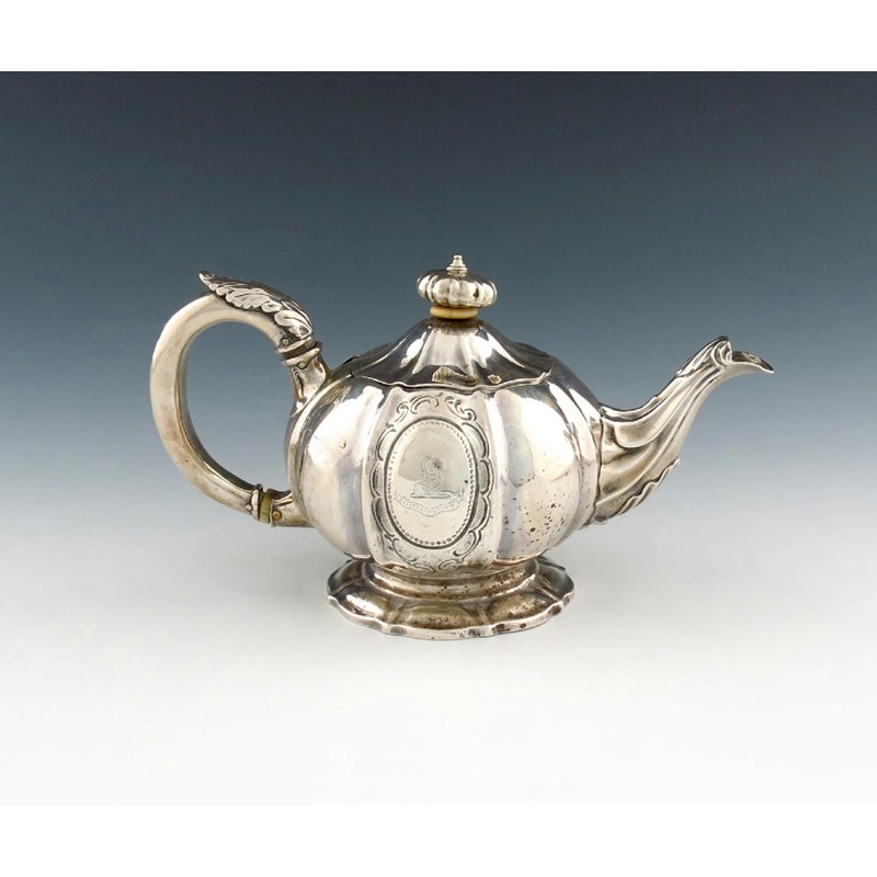 lobed circular form, leaf capped scroll handle, domed cover with a fluted finial, engraved with a crest, the underside later inscribed, length handle to handle 9.5cm, approx. weight 10oz.