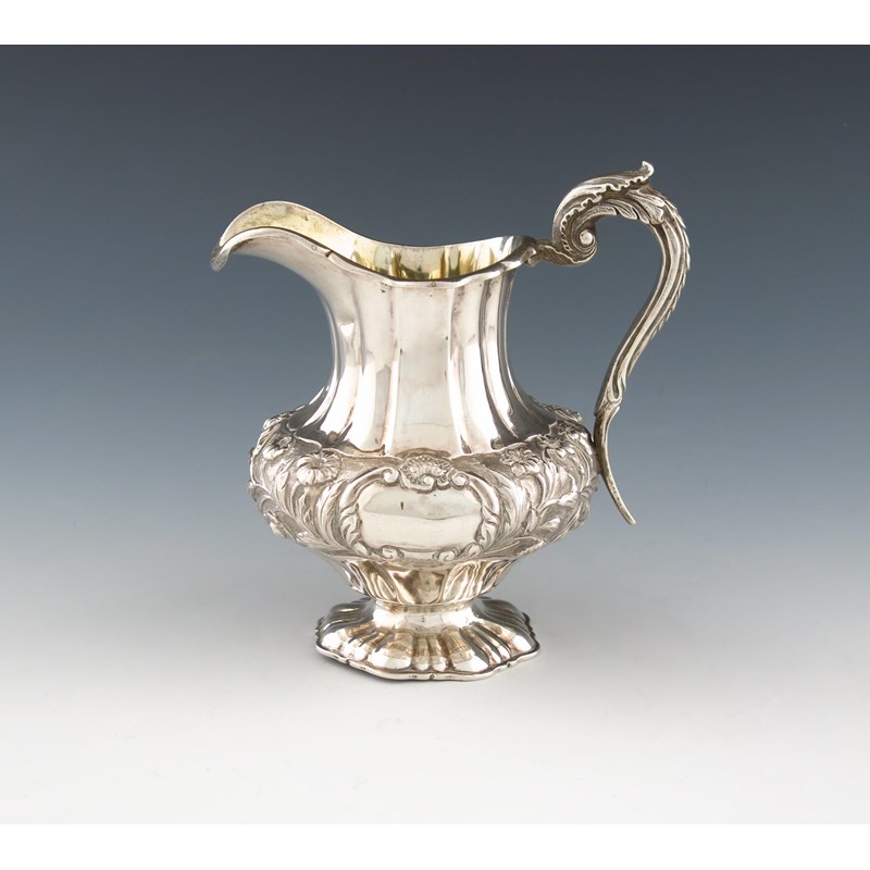 baluster form, embossed foliate decoration, on a matted background, leaf capped scroll handle, on a raised shaped circular foot, gilded interior, height 14.5cm, approx. weight 9oz.