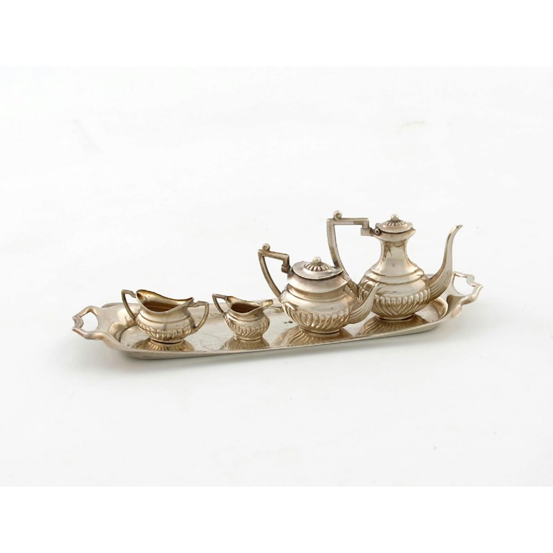 A miniature four-piece silver tea and coffee set with a tray