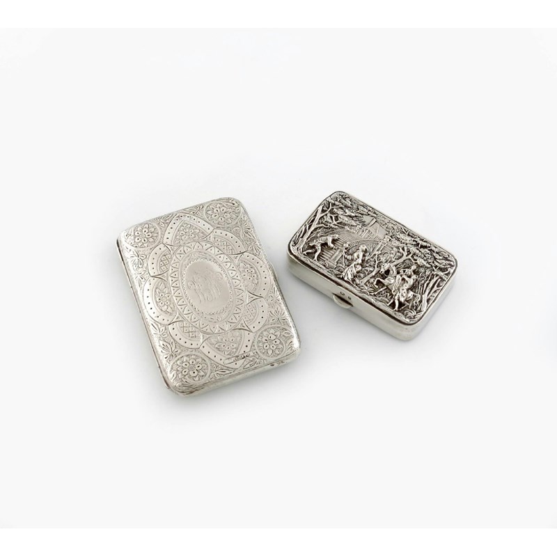 rectangular form, embossed with a woodland scene and courting couples, fitted with leather pockets, and a card case by the same maker, date letter worn, with engraved decoration and silk interior. (2)
