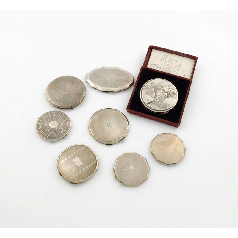 comprising: seven English examples, various shapes, with engine-turned decoration, plus a Japanese one with foliate decoration, in a case. (8)