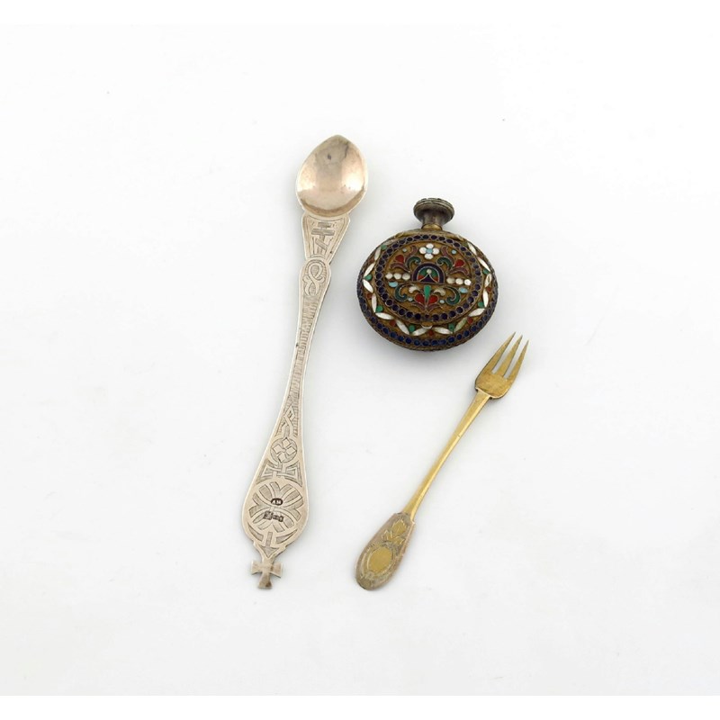 a spoon, with chased decoration and a cross finial, Moscow 1873, length 17.8cm, a silver fork, and a modern silver-gilt and enamel scent bottle, screw-off cover the hinged side with a compact, diameter 4.8cm. (3)