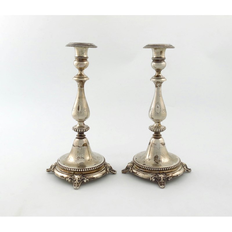 baluster stems, beaded borders, engraved foliate decoration, on raised circular bases on four bracket feet, height 27.8cm. (2)