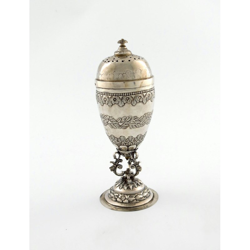 ovoid form, chased foliate borders, pierced bayonet fitting cover with a fluted finial, on three pierced foliate scroll supports on a raised circular foot, height 20.5cm, approx. weight 9oz.