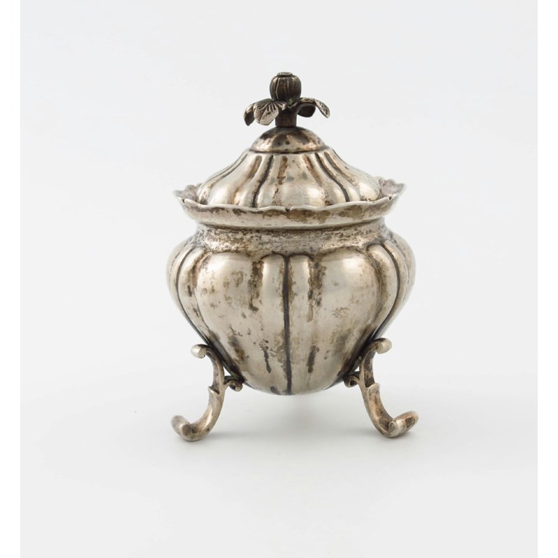 circular lobed baluster form, the pull-off cover with a foliate finial, on three scroll legs, height 13.5cm, approx. weight 9.3oz.