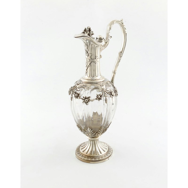 lobed baluster form, leaf capped scroll handle, the mounts with hanging garlands of flowers, the hinged cover with a foliate finial, on a raised fluted circular foot, height 33cm.