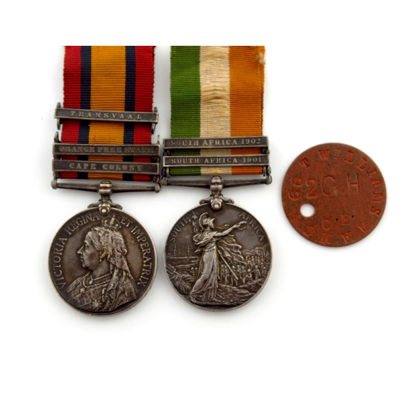 Boer War, unusual pair of Medical Corps medals, one British one Australian; QSA, three clasps, CC, OFS, Trans. (13146 Pte. T. Williams. R.A.M.C.); K.S.A. (1308 Pte. T. Williams. Aus: A.M.C.), with Australian 'dog tag' . Very fine. (3)