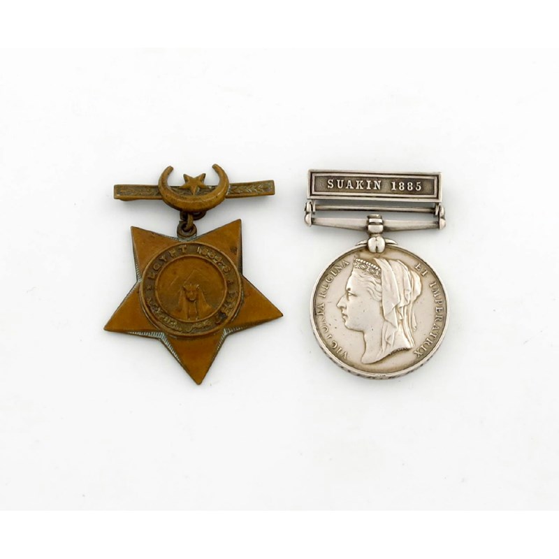 Egypt and Sudan, a pair to a driver on the projected Suakin to Berber Railway; Suakin, on the Red Sea, to Berber; Egypt and Sudan medal, 1882-1889, clasp, Suakin 1885 (Engine Driver G Rawlinson); Khedive's Star, 1884-6. Very fine. (2)
