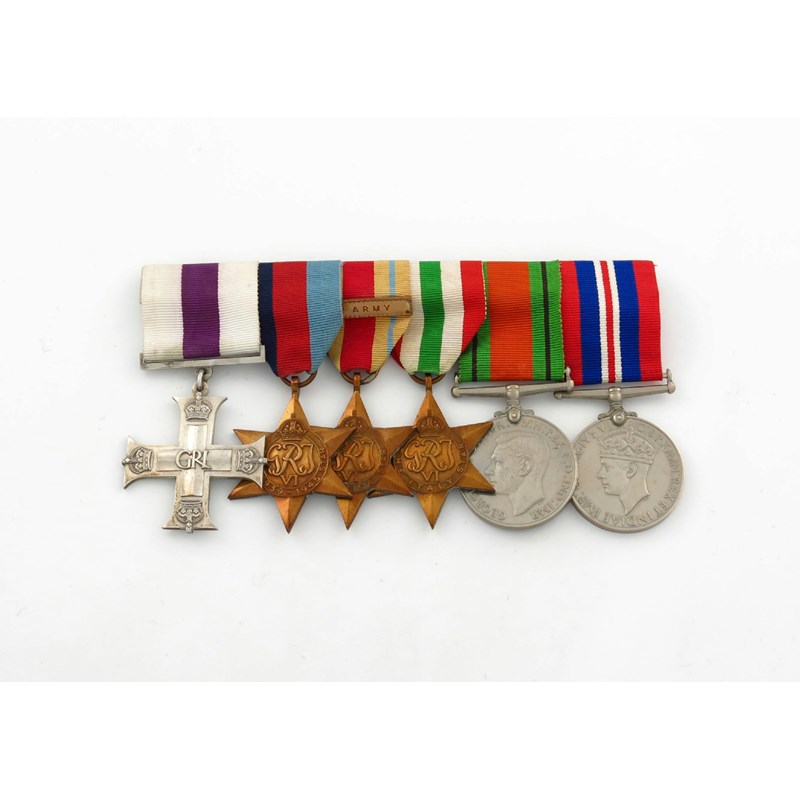 The Immediate North African Military Cross group of six medals, awarded to Lieutenant Bruce Robertson Hobbs, 9th King's Own Yorkshire Light Infantry, Queen's Own Yorkshire Dragoons, a Grand National winning jockey and later respected racehorse trainer: Military Cross (1943), 1939-45, Africa, with 8th Army Clasp, Italy stars; Defence and War medals, brooch mounted. Very fine. (6)