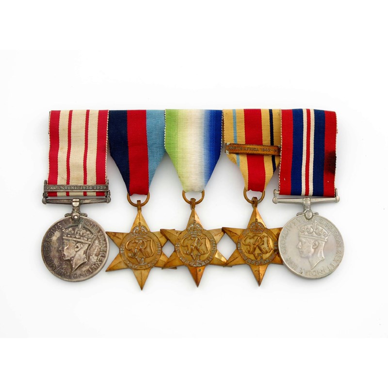 A Royal Marines Pre- and World War II group of five; Naval General Service, Geo VI, clasp Palestine 1936-1939 (Ply 22645 R. V. Hard. MNE. RM), 1939-45, Atlantic and Africa stars, War medal, brooch mounted. Very fine.