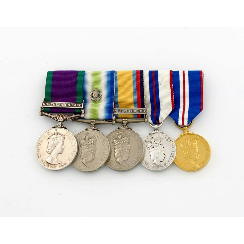 A good group of five medals to Lt. Col. Carel Bouwens, "the Blythe Sappers"; General Service medal, 1962-2007, clasp Northern Ireland (Lt. C. P.Bouwens. R.E.), South Atlantic medal, 1982, with rosette (Capt.), Gulf medal, 1992, clasp 16 Jan to 28 Feb 1991 (Maj.), Silver and Golden Jubilee medals, brooch mounted. Extremely fine.