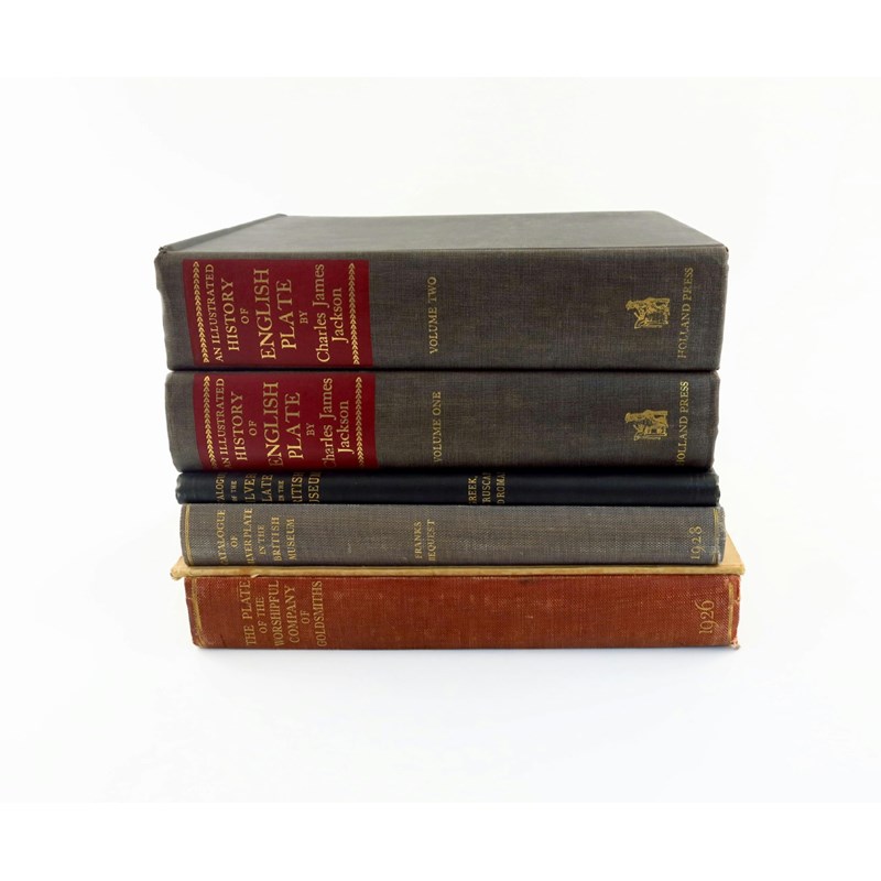 Six volumes of silver-related volumes, including Grimwade, A. G., Silver at Althrop, reprinted for the Society of Silver Collectors from The Connoisseur, October 1962, March, June, December 1963, March 1964, paperback; Carrington J. B. and Hughes, G. R., The Plate of the Worshipful Company of Goldsmiths, 1926, cloth bound; Jackson, C. J., An Illustrated History of English Plate, 1967, hard bound and three other publications. (6)