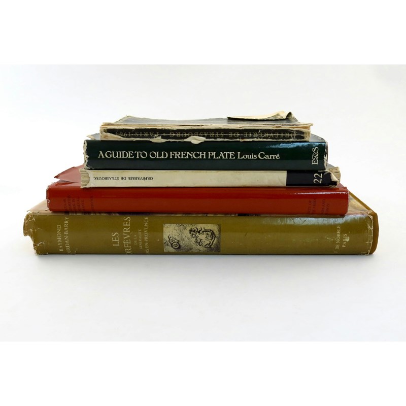 comprising: Jourdan-Barry, R., Les Orfevres de la Generalite D'Aix-en-Provence, hard bound with dust wrapper, 1974; Lightbrown, R. W., Secular Goldsmiths' Work in Medieval France: A History, 1978; Carre, L. A Guide to French Plate, 1971, and two other volumes. (5)