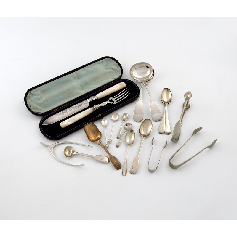 comprising: a cased cake knife and fork, engraved decoration, mother-of-pearl handles, by George Unite, Birmingham 1883, in a fitted case, plus a pair of Fiddle pattern sauce ladles, Sheffield 1904, a pair of wishbone sugar tongs, another pair of sugar tongs, three teaspoons, a sugar spoon, three condiment spoons, a teaspoon, and two pairs of electroplated sugar nips and two electroplated salt spoons, approx. weighable 9.5oz. (qty)