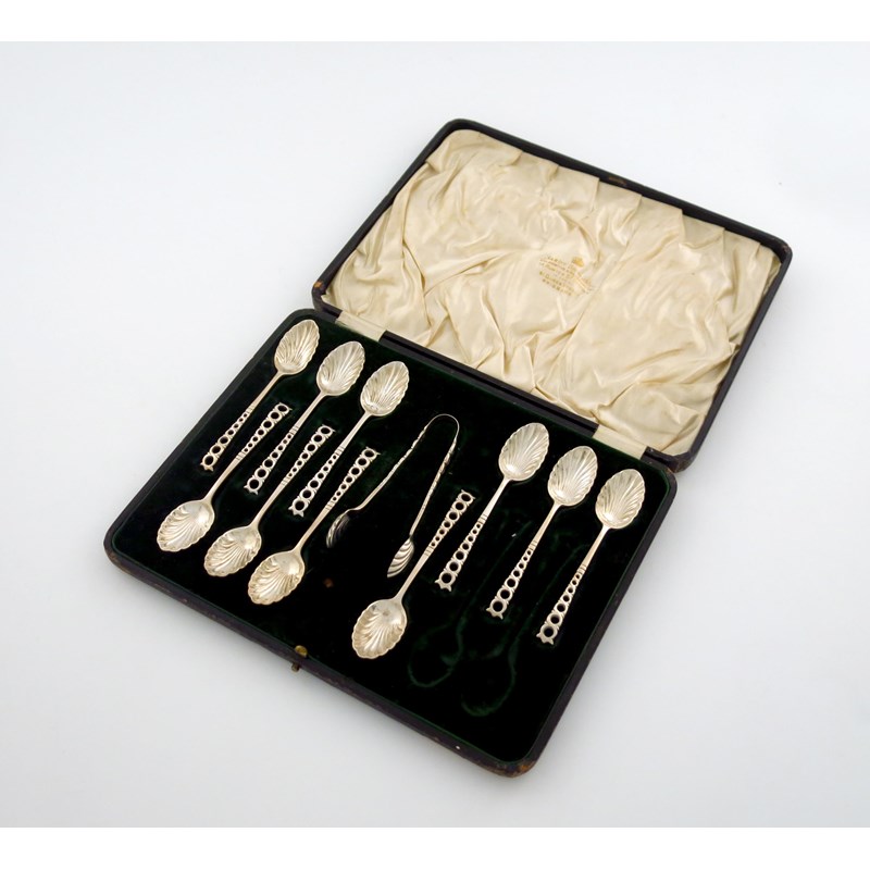 A set of ten Victorian silver teaspoons and sugar tongs,