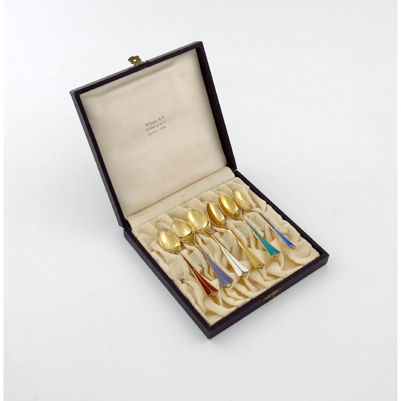 A set of six Danish silver-gilt and enamel coffee spoons