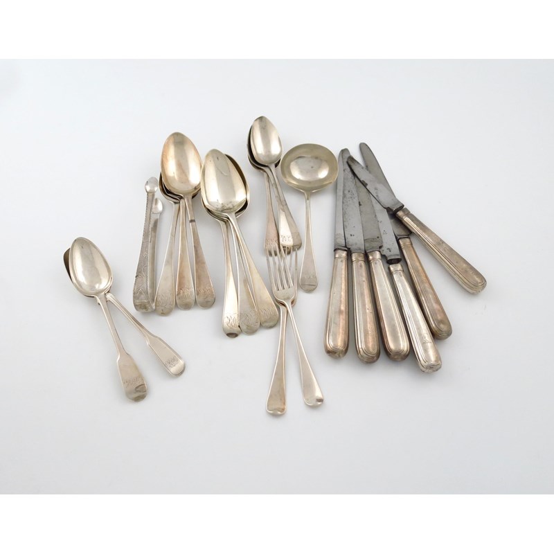 comprising: six tablespoons, a sauce ladle, three dessert spoons, two dessert forks, a pair of Bright-cut sugar tongs, plus six Thread pattern table knives, and two other dessert spoons of different patterns, approx. weighable 23oz. (qty)
