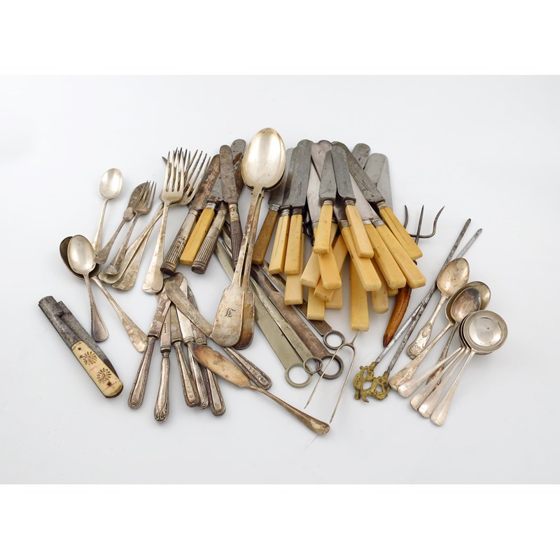 comprising: a bone-handled folding knife, the handle with painted decoration, a set of six table knives, six further table knives, five dessert knives, three silver-handled knives, plus electroplated items: a pair of basting spoons, four meat skewers, a pair of wishbone sugar tongs, and other items. (qty)