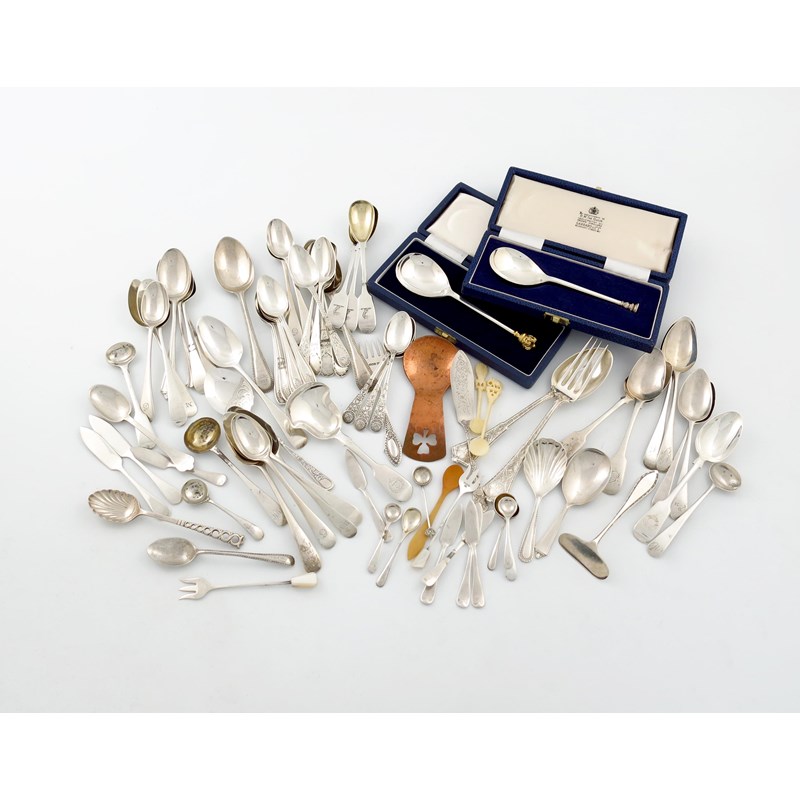 comprising: three caddy spoons, two cased spoons, a Tiffany christening fork and spoon, a set of six teaspoons, a set of six butter knives, three further butter knives, a jam spoon, a baby pusher, three Fiddle pattern egg spoons, four further egg spoons, a sugar spoon, three small forks, twenty-nine various teaspoons, plus various condiment spoons and a copper caddy spoon, marked A.J.H, Donegal, approx. weighable 31oz. (qty)