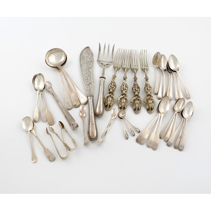 comprising: a pair fish servers, by Martin and Hall, Sheffield 1870, a pair of William IV sauce ladles, London 1836, a single sauce ladle, four pairs of sugar tongs, a matched set of eight Old English Thread pattern teaspoons, a Victorian Trefid teaspoon, plus fourteen various teaspoons, three salt spoons, and four continental metalware forks, and a pair of electroplated sugar tongs, approx. weighable 20oz. (qty)