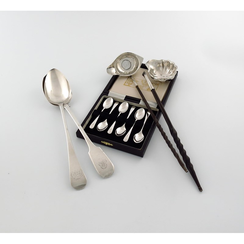 comprising: a George IV Old English pattern basting spoon, London 1824, an early-Victorian Fiddle pattern basting spoon, London 1837, a George II punch ladle, the oval bowl set with a coin, another punch ladle, (damaged), and a cased set of six teaspoons, approx. weighable 9oz. (5)