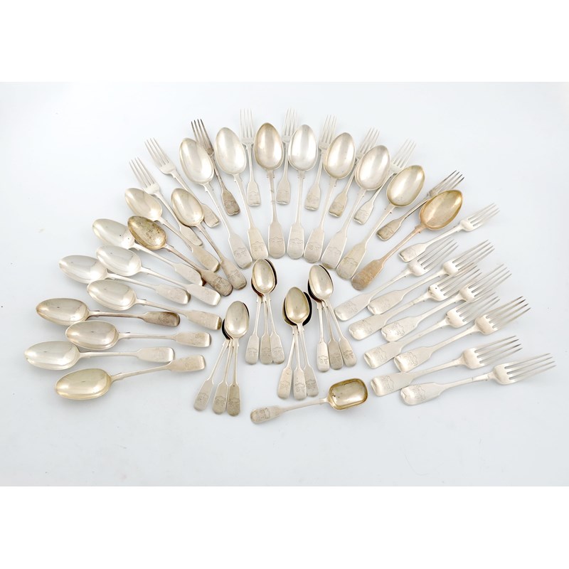 the terminals with the Kemey-Tynte crests, comprising: eight tablespoons, eight table forks, ten dessert forks, eleven dessert spoons, twelve teaspoons and a sugar spoon, approx. weight 80oz. (50)