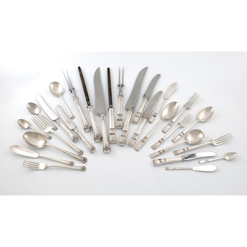 the terminals with a foliate and feather-edge motif, comprising: seven table forks, eight table knives, eight dessert forks, eight dessert knives, eight soup spoons, seven dessert spoons, eight fish knives, four tablespoons, seven teaspoons and a three-piece carving set, plus another electroplated canteen, comprising: seven table forks, eight dessert forks, eight fish forks, eight soup spoons, eight dessert spoons, four tablespoons, eight table knives, six dessert knives, eight cheese knives, eight fish knives, eight teaspoons, eight coffee spoons, eight butter knives and a three-piece carving set. (qty)