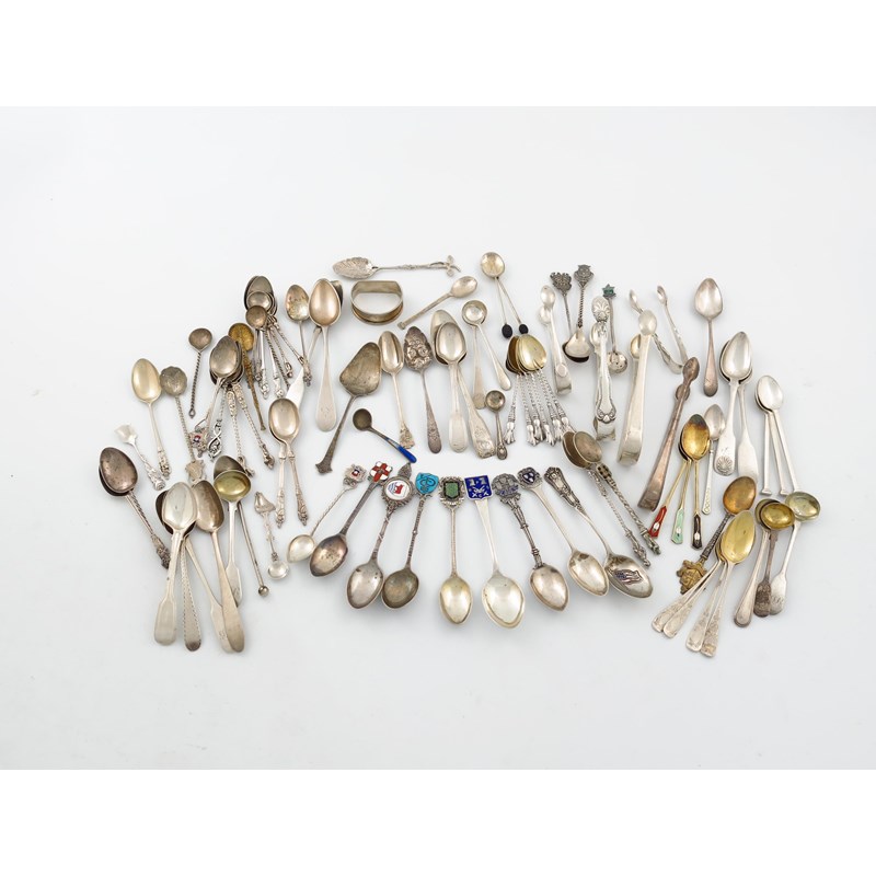 comprising: a pair of Fiddle and Thread pattern egg spoons, eight silver and enamel souvenir spoons, and various teaspoons, and condiment spoons, six teaspoons, plus various teaspoons and other items including a napkin ring, approx. weight 30oz. (qty)