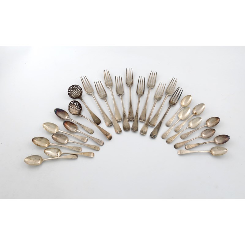 the terminals with a crest, comprising: ten table forks, fifteen teaspoons, and two sifting spoons, approx. weight 32oz. (27)