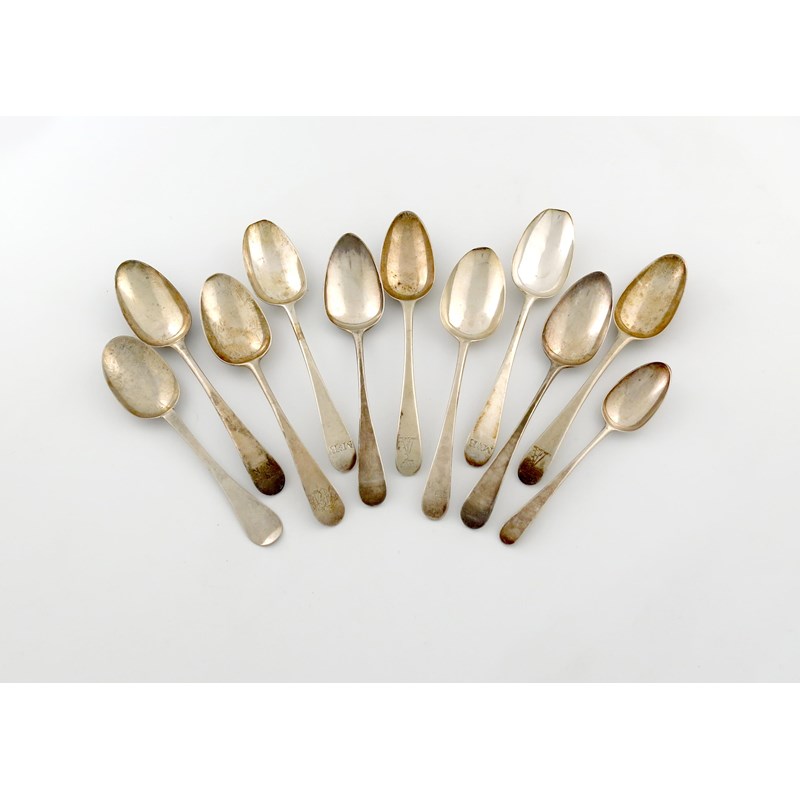 comprising: two pairs of tablespoons, five single tablespoons, and a dessert spoon, plus a spoon with maker's mark PS, the terminal of re-shaped and rounded form, probably from a trefid, approx. weight 19oz. (11)