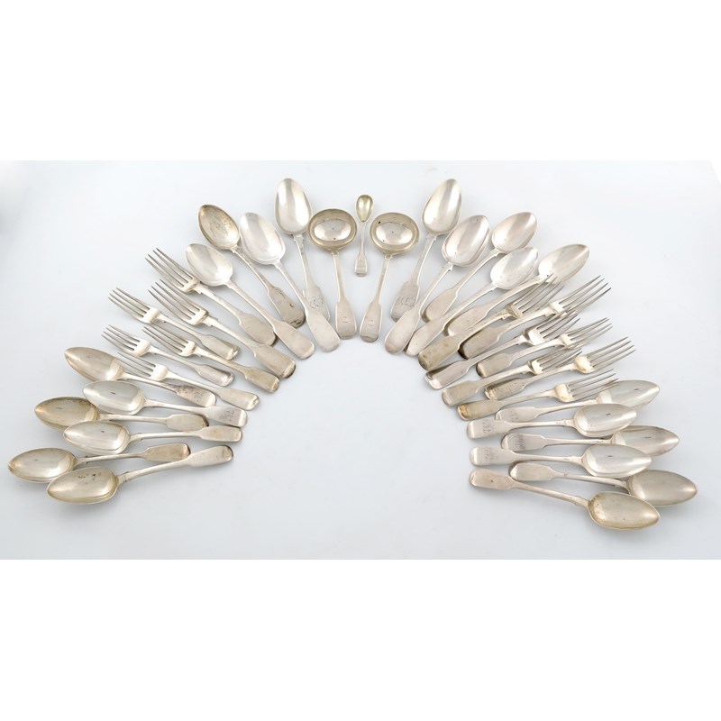comprising: nine tablespoons, five table forks, eight dessert forks, twelve dessert spoons, a pair of sauce ladles and a mustard spoon, approx. weight 61oz. (qty)
