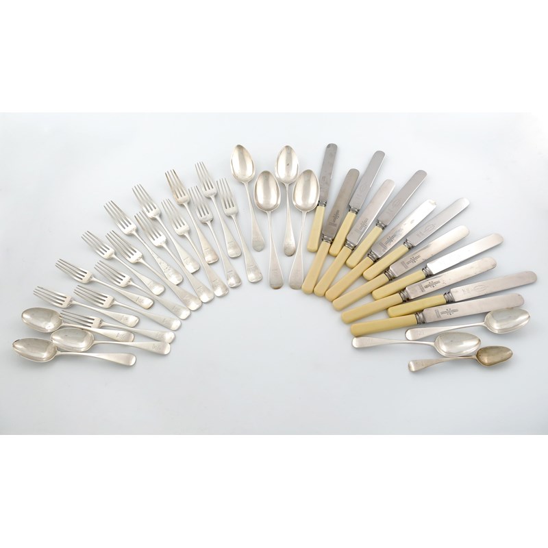 the terminals with a crest, comprising: nine table forks, six dessert forks, two tablespoons, five dessert spoons, a teaspoon, plus two George III tablespoons, and six ivorine handled table knives and six dessert knives, approx. weight 50oz. (qty)
