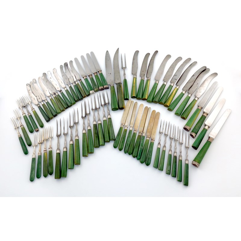 comprising: ten two pronged steel table forks, six two-pronged dessert forks, a set of ten table knives, a set of eleven dessert knives, plus four other table knives and four dessert knives, a carving fork, two carving knives and nine various fruit forks and eight fruit knives. (qty)