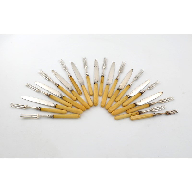 comprising: twelve fruit forks, and nine dessert knives, plain blades and tines, plus another fruit fork, ivory handles. (22)