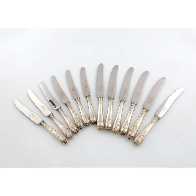 A set of six silver lace-back Trefid pattern table and dessert knives