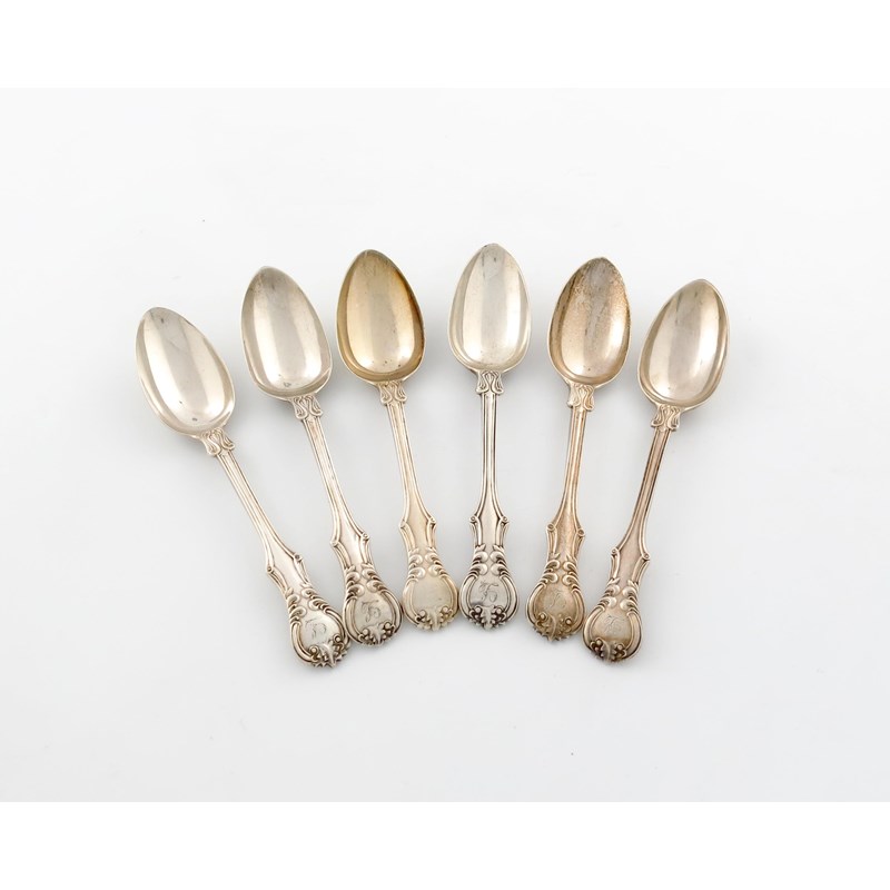 A matched set of six Victorian silver Victoria pattern dessert spoons