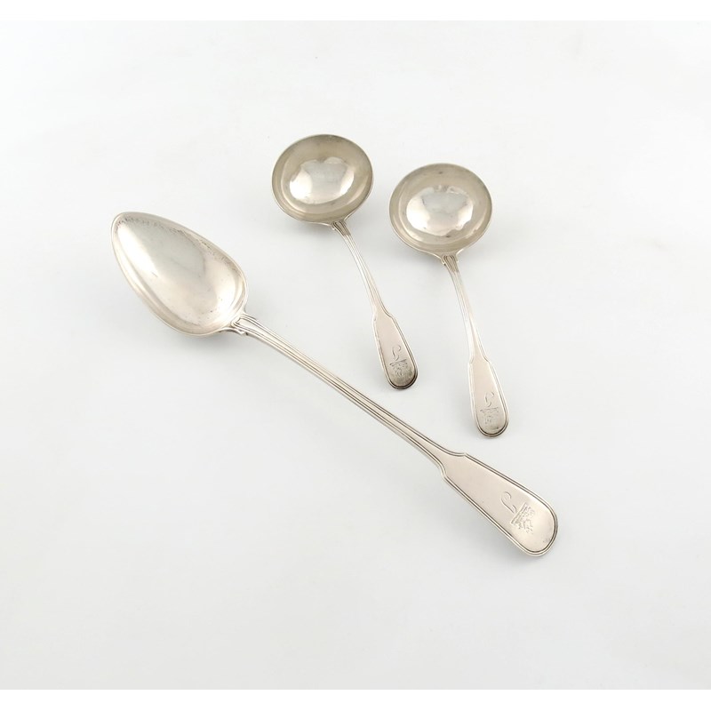 A George III silver Fiddle and Thread pattern basting spoon and pair of sauce ladles,