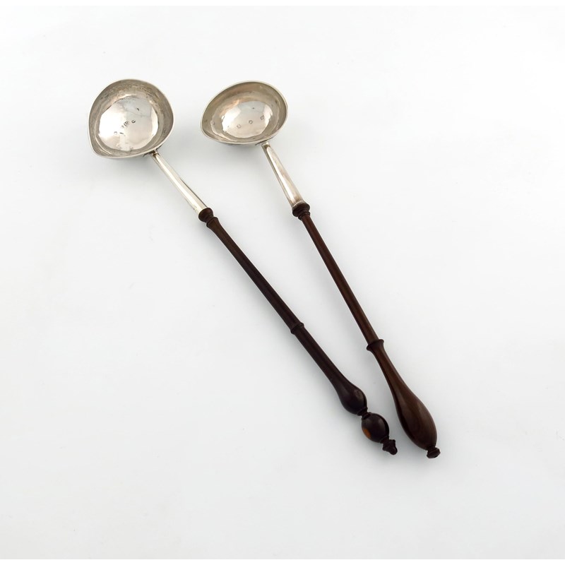 by George Greenhill Jones, London 1738, oval 'goose-egg' bowl turned wooden baluster handle, plus another George II silver punch ladle, possibly by William Justis, London 1735, oval 'goose-egg' bowl, turned wooden baluster handle, engraved with a crest, length 33cm. (2)